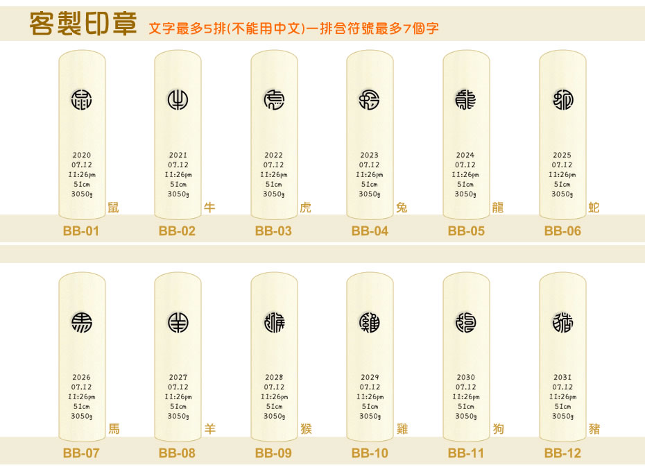 雕刻姓名: 印章編號: 印章文字: 木盒編號: 木盒文字: 編號 BBX 開頭為客製版木盒才需填寫文字,文字最多5排(限數字或英文)一排最多7個字
