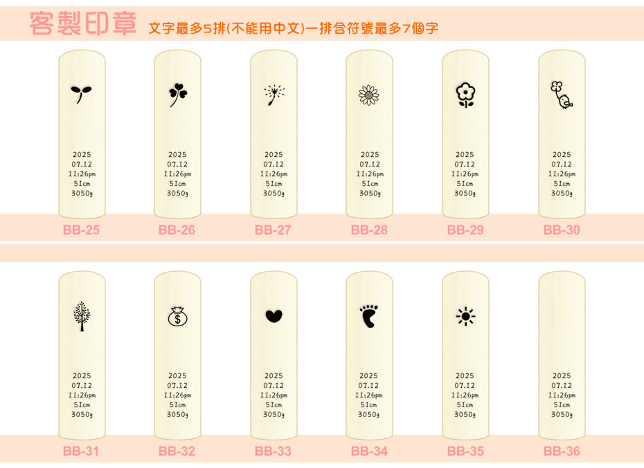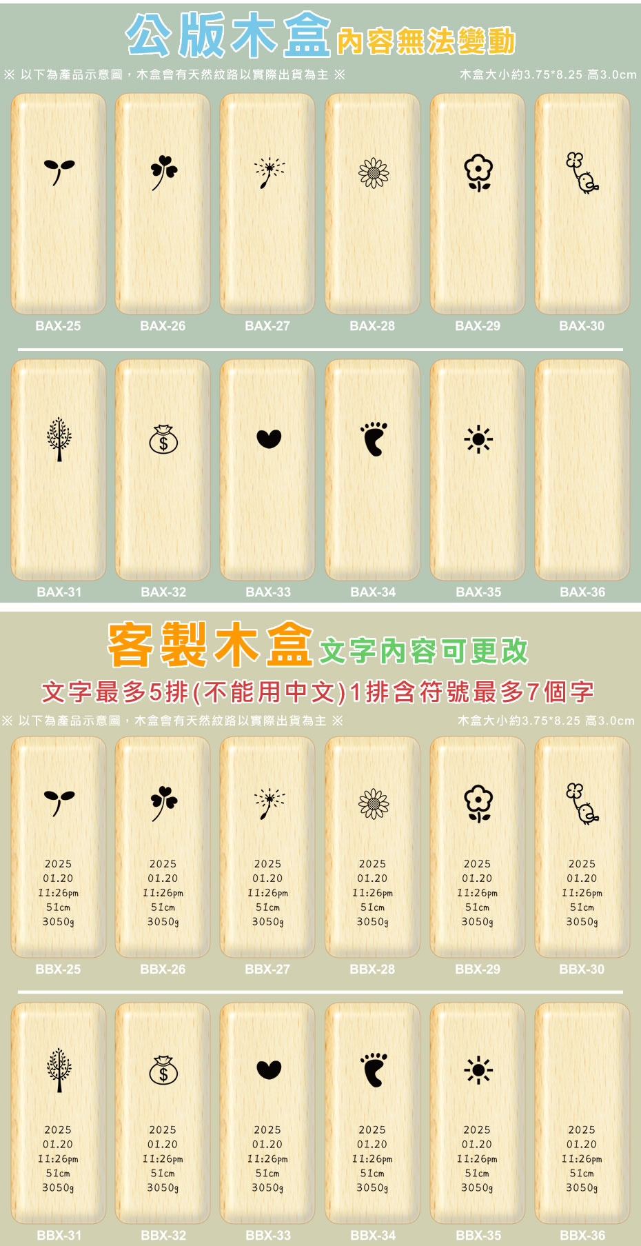 雕刻姓名: 印章編號: 印章文字: 木盒編號: 木盒文字: 編號 BBX 開頭為客製版木盒才需填寫文字,文字最多5排(限數字或英文)一排最多7個字